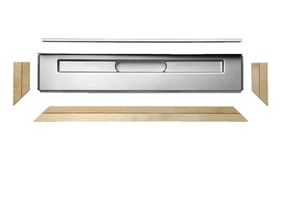 Sarja koostuu puisista etu- ja sivuprofiileista, jotka asennetaan ruuveilla kiinni puukoolaukseen. Varmistaa lattiakaivokalusteen oikean sijoituksen ja kiinnityksen. Lyhennä oikeaan mittaan leikkaamalla etuprofiilia.
