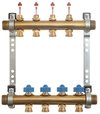 Virtausmittarilla varustettu Roth lattialämmitysjakotukki. Lattialämmitysjakotukki on rakenteeltaan lujaa, korroosiota kestävää messinkiä. Meno- ja paluujakotukissa 25 mm sivuttaissiirtymä piirien ulosotossa. Jakotukki on varustettu G25 (1) ulkokierteellä kummassakin päässä (tasotiivisteellä), mikä mahdollistaa syöttöputken liittämisen molemmin puolin. Lattialämmityspiirin kytkemiseen on 3/4 (G20) EURO ulkokierre. Meno-ja paluujakotukki on tehtaalla valmiiksi kiinnitetty seinäkannakkeeseen. Virtausmittarissa on asteikko 0,1 4 l/min. Järjestelmän neste ei ole suorassa yhteydessä mittarin lasiin, mikä eliminoi riskin, että siihen tarttuu likaa.